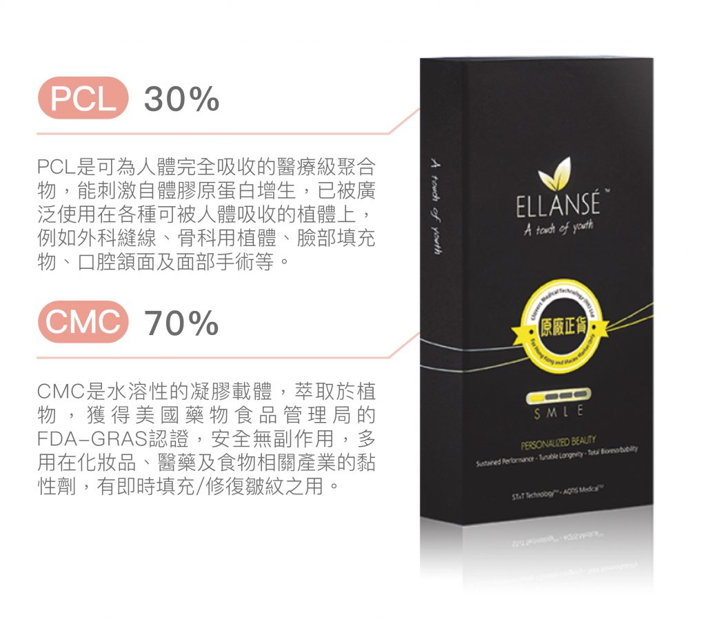 ELLANSÉ少女針是由30% PCL聚己內酯(polycaprolactone) + 70% CMC凝膠 (Carboxymethyl cellulose)所組成。 CMC凝膠用作即時填充,PCL則持續刺激優質膠原蛋白增生。 專利PCL微球獲FDA等國際安全認證,100%可被人體吸收。